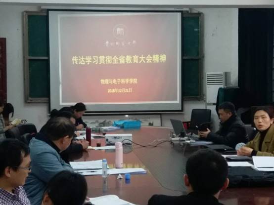 会上,陈世国传达学习了12月14日召开的全省教育工作会议精神。指出:全省教育大会全面总结了我省的教育工作,对未来一段时期教育发展作了明确规划,希望我院全体教师认真领会大会精神,结合省委省政府对贵州未来教育发展的总体要求,切实做好学科建设、人才培养、教学科研等工作,特别重视中等学校物理师资的人才培养工作,为贵州教育事业发展添砖加瓦。