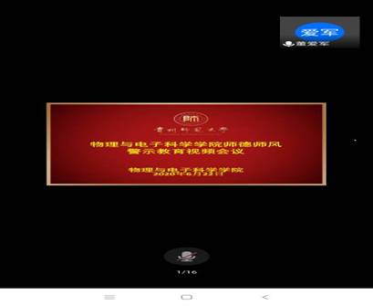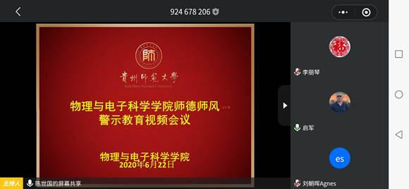 6月22日,物理与电子科学学院采取腾讯视频会议方式,召开了“立德• 铭责”师德师风警示教育大会,会议由学院党委书记陈世国主持,院长支启军总结并提出具体要求,全院教职工参加了会议。